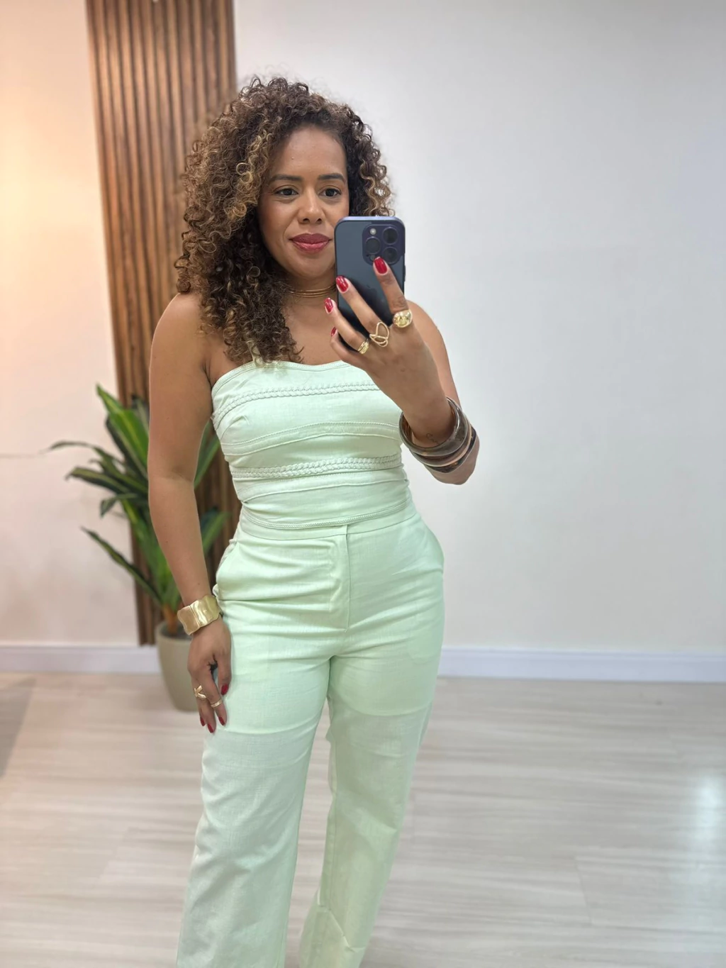 Conjunto de blusa e calça, blusa com bordado e forrada na parte da frente, alça com regulagem, zíper nas costas. Calça possui forro, com bolso faca e fechamento por zíper. Ele é muito versátil, estiloso e elegante, as peças podem ser usadas também separadas! Uma peça super curinga para ter no guarda roupa!