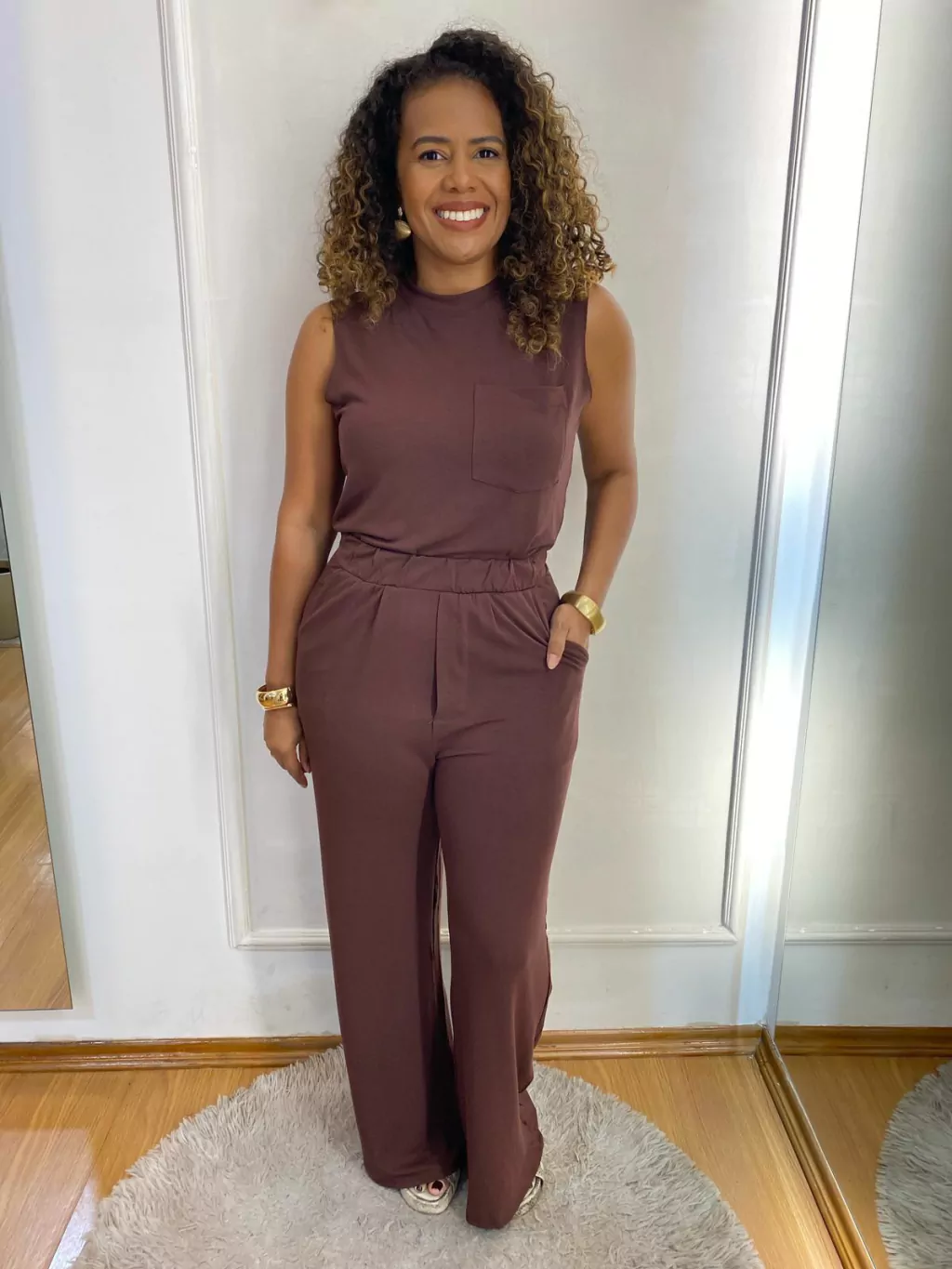 Conjunto em moletinho sem mangas, blusa possui bolso frontal, prático, casual, confortável e versátil. Modelo de calça modelo reta com bolsos laterais. As peças também ficam ótimas quando usadas separadamente, com tênis, uma rasteira também é uma opção. Para um home office ou um passeio no final de semana, ele é imprescindível em seu guarda roupa.