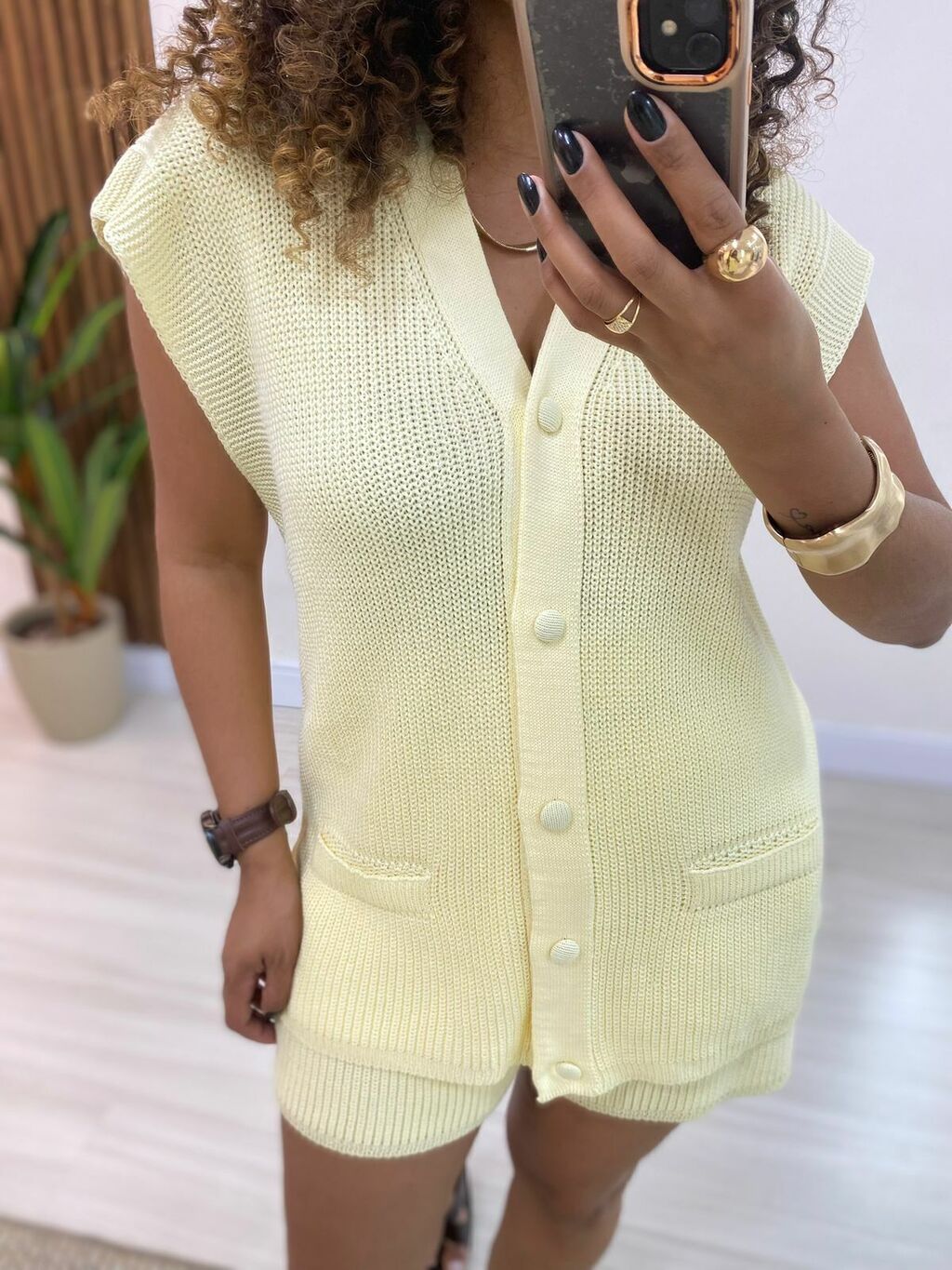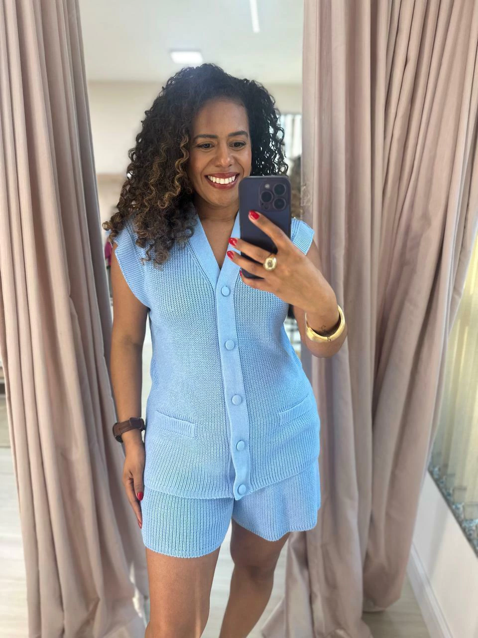 O Conjunto de tricô é uma opção confortável para quem busca um look estiloso, shorts forrado, blusa com fechamento em botão, agregando funcionalidade ao visual.