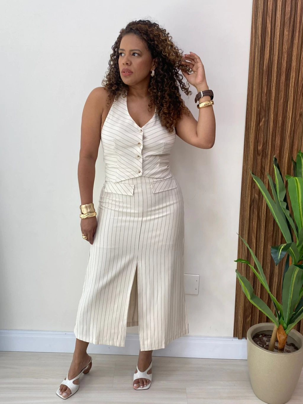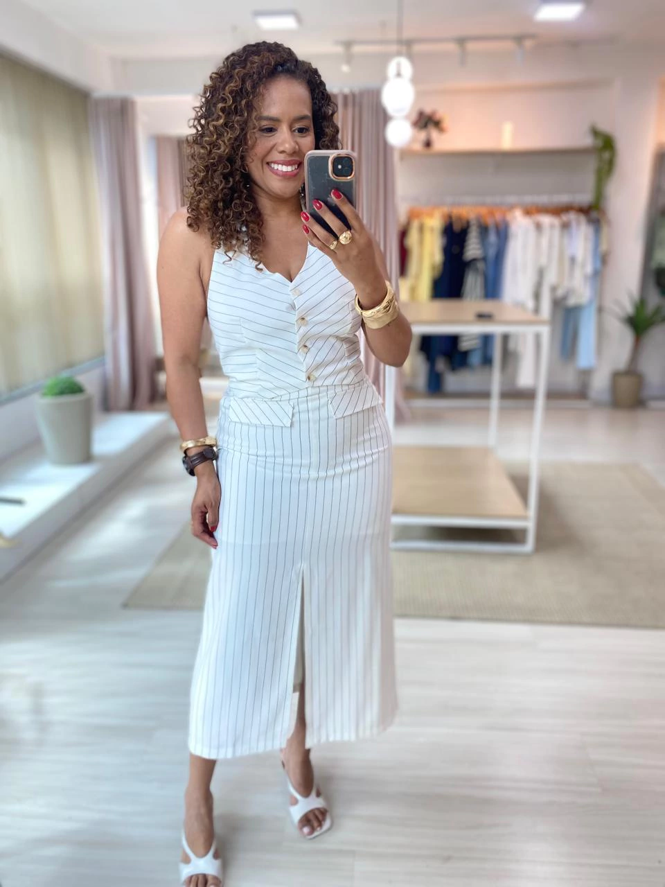 Conjunto de blusa e saia, a saia forrada com fechamento por zíper na lateral e bolsos falso, blusa forradae fechamento com laço nas costas. Ele é muito elegante e versátil! Uma peça super curinga para ter no guarda roupa! Leve e confortável que garante conforto e estilo.