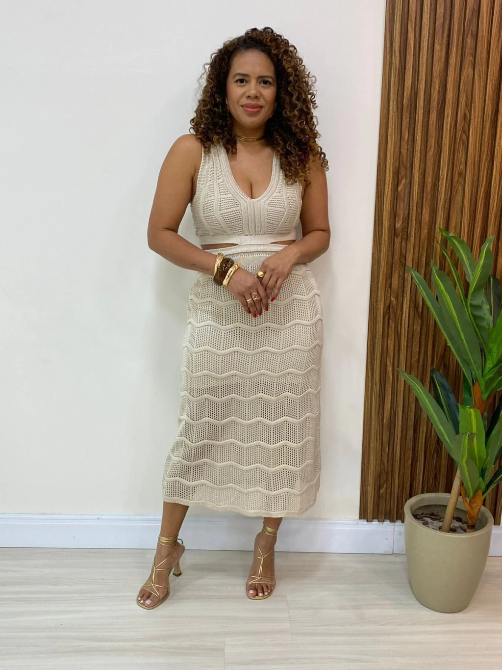Vestido comprimento midi, recorte na cintura em tricô e forrado. Possui um caimento impecável e conforto excepcional. Tamanho único adapta-se perfeitamente a menequins do 36 ao 44. Valoriza a silhueta e oferece estilo e modernidade.